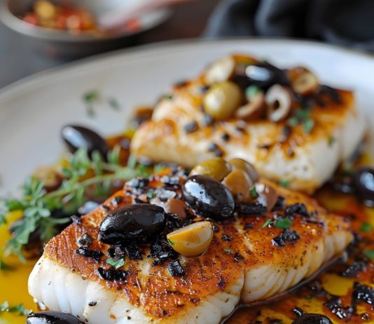 Savory Pan-Grilled Cod with Paprika, Olives & Garlic